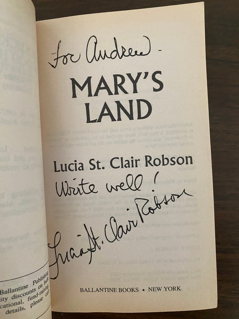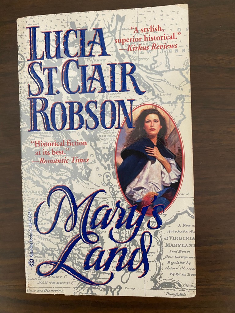 It was at a meeting of the Annapolis chapter of the MWA that I had my copy of Lucia St. Clair Robson‘s Mary’s Land inscribed.